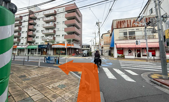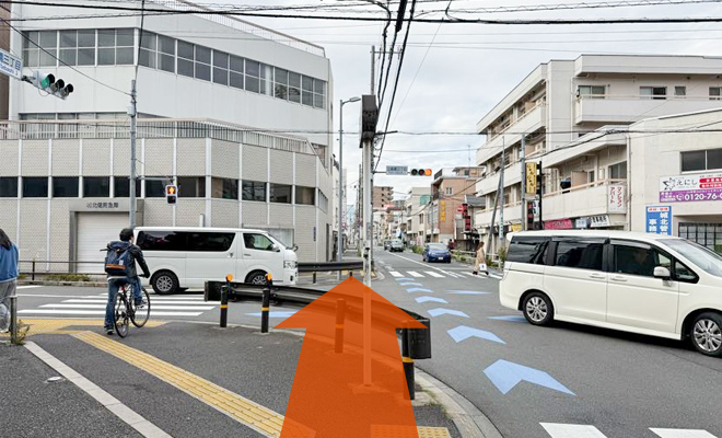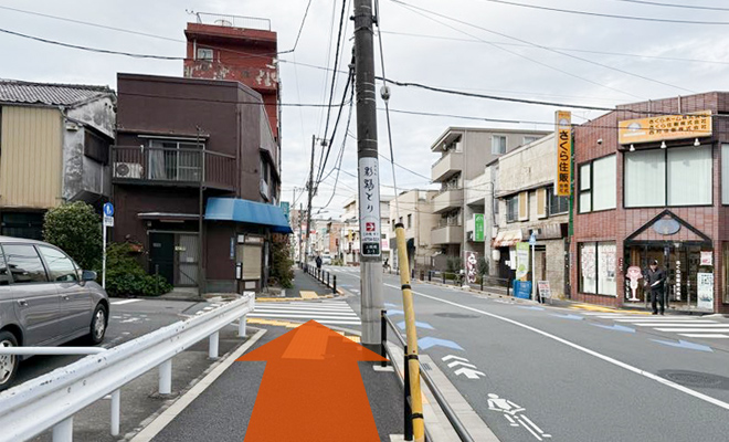 一つ目の横断歩道を渡り、そのまま直進します。 -